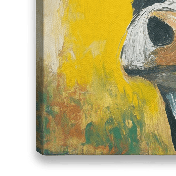 Een koe staat voor een felgele achtergrond en kijkt verbaasd. De krachtige penseelstreken geven de afbeelding een speelse en levendige uitstraling en trekken meteen de aandacht.