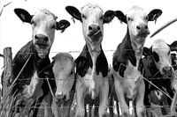Nieuwsgierige koeien, in zwart wit, in een weiland in Udenhout, Nederland.
