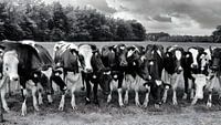 Nieuwsgierige koeien op een rij in zwart-wit. Ook aanwezig in kleur. Vtwonen