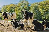 Koeien die genieten in van de zon in hun eigen wei. En altijd nieuwsgierig. Al won bij sommige van hen ook de luiigheid.