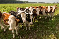 Nieuwsgierige roodbonte koeien in een weiland nabij Winterswijk in de Achterhoek in Nederland. Deze jonge vaarsen waren erg geinteresseerd in de fotograaf die net buiten het weiland in eerste instantie de intentie had iets anders te fotograferen. Door de keuze van een groothoek lens was het mogelijk nagenoeg de gehele kudde vast te leggen met de horizon bovenaan de foto, zodat er veel diepte ontstaat.