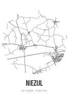 Zwart-witte landkaart, stratenplan of plattegrond van Niezijl. Niezijl is gelegen in de gemeente Westerkwartier, provincie Groningen. Op de stadskaart zijn alle openbare wegen in Niezijl opgenomen. Verder is de kaart voorzien van de coördinaten van het centrum van Niezijl.