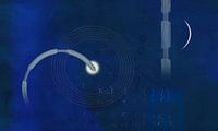 Waar deze figuren zich bevinden is niet helemaal duidelijk. Het zal de ruimte wel zijn. De abstracte elementen bewegen en de trillingen worden weergegeven. Er is veel blauw en wat grijs.