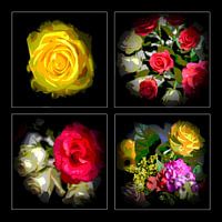 4 bewerkte kleurige bloemen op zwarte ondergrond.