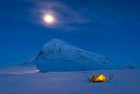 Tent aan de voet van de prachtige berg Nijak, in het besneeuwde berglandschap van Sarek Nationaal Park. Lapland, Zweden.
