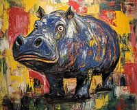 Nijlpaard Schilderij - Dit kleurrijke schilderij toont een nijlpaard, gevangen in een expressieve toets met levendige en contrasterende kleuren van rood, geel en blauw.