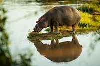 Een nijlpaard snuffelt aan een steen nadat hij een kleine schildpad met zijn bek in het water heeft geduwd. Een prachtig tafereel in het Kruger National Park, Zuid-Afrika.