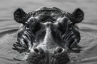Op de zwart-wit close-up foto staat een nijlpaard tegen een lichte achtergrond. De grove, gerimpelde huid is duidelijk zichtbaar, elke plooi benadrukt door het licht. De ogen, klein en expressief, kijken kalm maar waakzaam. De wijd openstaande neusgaten en de krachtige, indrukwekkende kaken komen scherp naar voren, accentuerend zijn robuuste kracht.