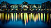 Nijmegen by night. De skyline van Nijmegen met de nieuwbouw aan de Waalhaven. Doordat de zon net onder is en de lucht nog niet helemaal donker, is er een mooie balans tussen de lucht en de buitenverlichting. De lampjes worden weerspiegeld in het stille water van de Waalhaven. De Waalhaven, ook bekend als Nieuwe Haven, is een haven in de Nederlandse stad Nijmegen. De haven is gelegen aan de Waal, net voorbij de Nieuwe Hezelpoort en direct naast de Spoorbrug. De haven werd in 1852 en 1853 aangelegd als vervanger van de Oude Haven, die ter hoogte van het midden van de huidige Waalkade gelegen was, en was een industriehaven. Die functie had de haven tot midden jaren '90. Sindsdien is het een vluchthaven en aanlegplaats voor de beroepsvaart. Er liggen ook enkele woonboten. In de jaren '30 werd de haven in het kader van de werkverschaffing uitgebreid in westelijke richting. In deze zelfde periode is de naam gewijzigd van Nieuwe Haven in Waalhaven.