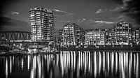 Nijmegen by night. De skyline van Nijmegen met de nieuwbouw aan de Waalhaven. Doordat de zon net onder is en de lucht nog niet helemaal donker, is er een mooie balans tussen de lucht en de buitenverlichting. De lampjes worden weerspiegeld in het stille water van de Waalhaven. De Waalhaven, ook bekend als Nieuwe Haven, is een haven in de Nederlandse stad Nijmegen. De haven is gelegen aan de Waal, net voorbij de Nieuwe Hezelpoort en direct naast de Spoorbrug. De haven werd in 1852 en 1853 aangelegd als vervanger van de Oude Haven, die ter hoogte van het midden van de huidige Waalkade gelegen was, en was een industriehaven. Die functie had de haven tot midden jaren '90. Sindsdien is het een vluchthaven en aanlegplaats voor de beroepsvaart. Er liggen ook enkele woonboten. In de jaren '30 werd de haven in het kader van de werkverschaffing uitgebreid in westelijke richting. In deze zelfde periode is de naam gewijzigd van Nieuwe Haven in Waalhaven.