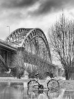 Hoogwater in rivier de Waal bij Nijmegen. Dit gebeurt enkele keren per jaar en de rivier heeft hier de afgelopen jaren de ruitme voor gekregen. onder de brug loopt het snel onder, terwijl de autoweg op de waalkade vbaak droogt blijft. de voetgangersbrug naar de Stadswaard is echter al snel onbereikbaar. En je moet ook niet vergeten je fiets op tijf weg te halen. De Waal is een Nederlandse rivier. Ter hoogte van Pannerden splitst de Rijn zich in het Pannerdensch Kanaal, dat 6 km verderop overgaat in de Nederrijn, en de Waal. De Waal is veruit de waterrijkste arm van de Rijn in Nederland (65% van de waterafvoer) en ook de voornaamste voor de scheepvaart. De totale lengte van de Waal bedraagt 82 kilometer. De Waal gaat vanaf de vroegere samenvloeiing met de Maas bij Woudrichem (nu de Afgedamde Maas) over in de Merwede en stroomt vervolgens via verschillende routes naar de Noordzee; het meeste water stroomt via de Nieuwe Merwede in het Hollandsch Diep. Het water tussen de Noord en de Oude Maas, ten zuiden van Ridderkerk, heet eveneens de Waal: dit deel van ca. 9 km lengte is een overblijfsel van een vroegere ligging van deze rivier. De Waal wordt met de Nederrijn en Amsterdam verbonden door het Amsterdam-Rijnkanaal (bij Tiel) en met de Maas door het Maas-Waalkanaal (bij Nijmegen) en het Kanaal van St. Andries. Op dat laatste punt vloeien de Waal en de Maas op een afstand van 1,9 km langs elkaar heen. De getijden van de Noordzee werken door tot ongeveer Zaltbommel, waar een getijv