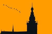 Nijmegen in avond oranje, met vlucht ganzen. De foto is bewerkt