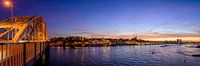 Skyline van de stad Nijmegen aan de oever van de Waal gezien vanaf de Waalbrug tijdens zonsondergang. Verschillende schepen passeren de rivier tijdens deze prachtige koude winter zonsondergang tijdens het blauwe uur aan het einde van de dag.