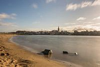 Mooi zicht op de benedenstad en het centrum van Nijmegen vanaf de overkant van de Waak, met bovenop de heuvel de Stevenskerk en de Stevenstoren. Mooie blauwe lucht, en rustig water maken het een mooie foto.
