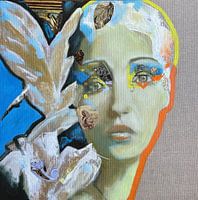 Abstract portret met klassieke elementen van de Griekse godin Nikè. Het originele werk is gemaakt met olieverf op canvasboard met stukjes bedrukt papier.