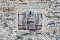 Gesloten luiken in gemetselde muur. Door het vervallen uiterlijk met de verbleekte kleuren lijkt deze foto bijna een abstract schilderij. Het vale rood lijkt nu wel een natuurlijke kleur. Het grove stucwerk en metselwerk geeft deze foto een ruige robuuste industriele rustieke uitstraling.