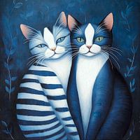 Twee katten zitten dicht bij elkaar. De ene heeft blauwe en witte strepen, de andere een effen blauw lichaam. Beide katten hebben een uniek blauw-wit vachtpatroon en doordringende groene ogen tegen een donkerblauwe bladachtergrond.