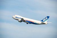 Een Boeing 747 van Nippon Cargo stijgt op vanaf Schiphol Airport Amsterdam. Registratienummer JA 18KZ. Vliegt de route Nederland naar Japan.