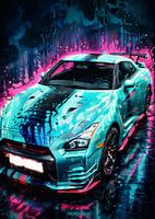 Een Nissan GT-R R34 in neon aquarel legt het legendarische, gespierde ontwerp van de auto vast met levendige neonkleuren. De gloeiende accenten benadrukken de agressieve houding en iconische kenmerken, terwijl de aquarelstijl vloeiendheid en diepte toevoegt, waardoor het een moderne, opwindende twist krijgt.