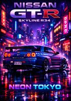 Op cyberpunk geïnspireerd artwork met de legendarische Nissan GT-R R34 in een neonverlichte Tokio-nacht. Levendige kleuren, futuristische stadslichten en straten vol regen creëren een krachtige sfeer waarin JDM-cultuur, straatraces en moderne digitale kunst samenkomen.