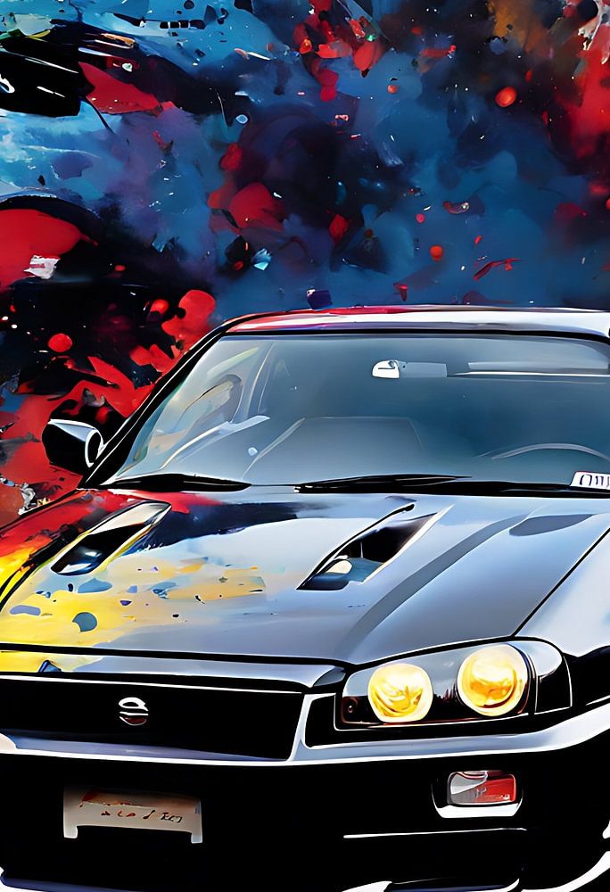 Splash art versie van de NISSAN GTR R34 dit is een iconische auto en nu wordt deze auto nog beter laten zien doormiddel van de splash art. Dit is gemaakt met AI