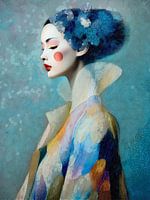 Kleurrijk portret van een vrouw in voornamelijk blauw en geel tinten met een grove textuur.