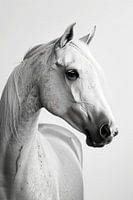 De witte achtergrond zorgt voor een serene en tijdloze uitstraling, waardoor alle aandacht naar de expressieve blik en de subtiele kenmerken van het paard gaat. Dit kunstwerk straalt een gevoel van kalmte en nobelheid uit, perfect voor liefhebbers van paarden en dierenkunst. Het gebruik van grijstinten en het ontbreken van kleur benadrukken de klassieke schoonheid en de artistieke waarde van het portret.