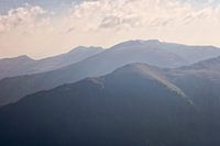 De ronde bergtoppen van de Nockbergen worden door het vroege ochtendlicht geraakt. De flanken in het dal liggen nog in de schaduw. De foto is digitaal bewerkt om een dromerige sfeer te creëren.