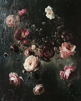 Een tijdloze bloemcompositie met de uitstraling van een oud Hollandse meester, badend in zacht dramatisch licht. Deze weelderige bloemen lijken te zweven in het donker, als een moment van vergankelijke schoonheid gevangen tussen licht en schaduw. De rijke kleuren, subtiele glans en diepte geven dit kunstwerk een klassieke en…