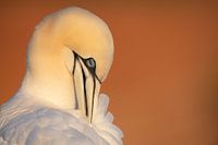 Deze Jan van Gent was nog even zijn veren aan het poetsen voor het slapen gaan. Het avondlicht dat achter op de rots valt, geeft de mooie warme rode achtergrond. Wat een mooie vogels zijn die Jan van Genten toch. Net of ze geschilderd zijn.