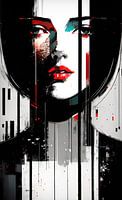 Als je op zoek bent naar een eye-catching kunstwerk, bekijk dan "Noir Desire". Dit abstracte mixed media-kunstwerk bevat een portret van een jonge vrouw weergegeven in een kleurenschema van zwart, rood en een sprankje turquoise.