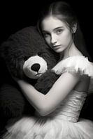 Een zwart en wit portret van een brunette ballerina met haar knuffelbeer.