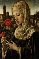 Het schilderij toont een Italiaanse non in een gedetailleerd en artistiek portret dat haar bescheidenheid en spirituele schoonheid benadrukt. De non is afgebeeld met fijne details en een kalme uitstraling die haar toewijding en vredigheid benadrukken. Ze houdt een rode bloem in haar hand, die kan worden geïnterpreteerd als een symbool van liefde, passie of opoffering. Op de achtergrond is een Italiaanse renaissancestad te zien, die een elegante en nobele sfeer creëert. De stijl van het schilderij doet denken aan de sierlijke techniek en het decoratief realisme van Carlo Crivelli, een belangrijke Italiaanse renaissanceschilder die bekend staat om zijn gedetailleerde altaarstukken en portretten van de Madonna.
