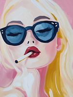 Nonchalance in pastelkleuren. Een close-up portret van een jonge vrouw met bril en sigaret in haar mond. Een echte blikvanger voor je interieur!