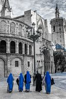 Nonnen in blauw en priester voor de kathedraal op Plaza de la Virgen in Valencia Spanje
