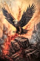 Deze prachtige vogel is een genot om naar te kijken, hoewel een ras echte roof en prooi vogel. In deze serie heb ik na aanleiding van de spreuk " de adelaar is geland " in feite gekozen vanuit een persiflage op de huidige situatie in de wereld.