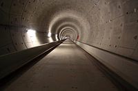De betonnen metro tunnel van de noord zuid lijn metrolijn 52 in Amsterdam toen deze nog in aanbouw was. Zwart wit. Geschiedenis