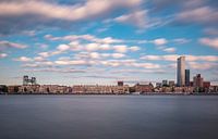 Het Noordereiland in de Maas, in Rotterdam, met aan de rechterkant een deel van de Kop van Zuid met de Maastoren.