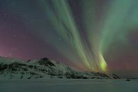 Noorderlicht, poollicht of Aurora Borealis in de nachtelijke hemel boven de Lofoten-eilanden in Noord-Noorwegen. Breed panoramisch beeld met besneeuwde bergen en een meer op de voorgrond.