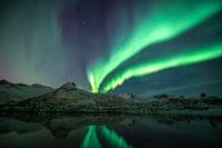 Op de Lofoten, boven de poolcirkel, zorgen lange winternachten en minimale lichtvervuiling voor ideale kijkomstandigheden. Van september tot april onthult de heldere hemel vaak dit hemelse schouwspel, dat weerkaatst op het stille water beneden en de besneeuwde bergtoppen verlicht. Het contrast tussen de donkere silhouetten van de bergen en de levendige kleuren van het noorderlicht zorgt voor een onvergetelijke visuele ervaring.