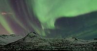 Noorderlicht, poollicht of Aurora Borealis in de nachtelijke hemel boven de Lofoten eilanden in Noord-Noorwegen. Een heldere straal stijgt op van de hoge, met sneeuw en ijs bedekte toppen in de verte.