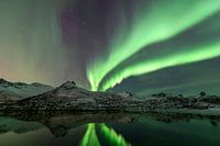 Noorderlicht, poollicht of Aurora Borealis in de nachtelijke hemel boven de Lofoten eilanden in Noord-Noorwegen. Breed panoramisch beeld met besneeuwde bergen en een fjord op de voorgrond. Het licht wordt weerspiegeld in het water op de voorgrond.