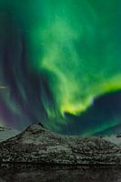 Noorderlicht, poollicht of Aurora Borealis in de nachtelijke hemel boven de Lofoten-eilanden in Noord-Noorwegen. Breed panoramisch beeld met besneeuwde bergen en een meer op de voorgrond.