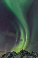 Noorderlicht, poollicht of Aurora Borealis in de nachtelijke hemel boven de Lofoten eilanden in Noord-Noorwegen. Een heldere straal stijgt op van de hoge, met sneeuw en ijs bedekte toppen in de verte.