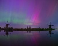 Het was magisch om dit bijzondere fenomeen vast te leggen, en dat gewoon zo dicht bij huis. De iconische molens, gehuld in het mysterieuze groen en paars van het noorderlicht, vormden een beeld dat je normaal alleen in verre noordelijke landen verwacht.