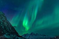 Noorderlicht, Poollicht of Aurora Borealis in de nachtelijke lucht boven de Lofoten in het Noorden van Noorwegen. Poollicht wordt veroorzaakt door de zonnewind waarbij grote hoeveelheden geladen deeltjes door het magnetisch veld van de aarde naar de Noord- en Zuidpool worden aangetrokken.