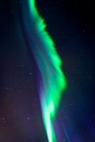 Noorderlicht, Poollicht of Aurora Borealis in de nachtelijke lucht boven de Lofoten in het Noorden van Noorwegen. Poollicht wordt veroorzaakt door de zonnewind waarbij grote hoeveelheden geladen deeltjes door het magnetisch veld van de aarde naar de Noord- en Zuidpool worden aangetrokken.
