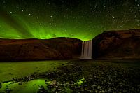 Het noorderlicht ook wel aurora genoemd boven de bekende waterval Skogafoss, met reflecties in het water.