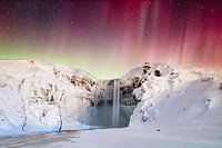 Mystieke en mysterieuze aurora borealis nacht bij de Skogafoss waterval in Zuid IJsland. Het noorderlicht is intens roodachtig van kleur.