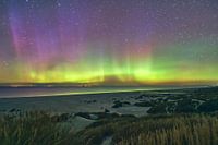 Noorderlicht danst boven de Jammer Bay in Noord-Denemarken. Ze gloeien de hele nacht in kleuren van groen tot paars over de kalme Noordzee.